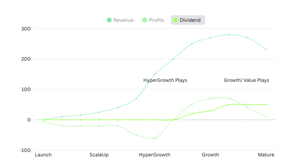 Every company goes through a simple lifecycle. It starts at Launch with high risk and no profits, then moves into ScaleUp where growth accelerates. The Turning Point is when the business finally becomes profitable. The Growth stage is where compounding happens and returns are strongest. Eventually, companies reach Mature/Death, where growth slows and profits decline.